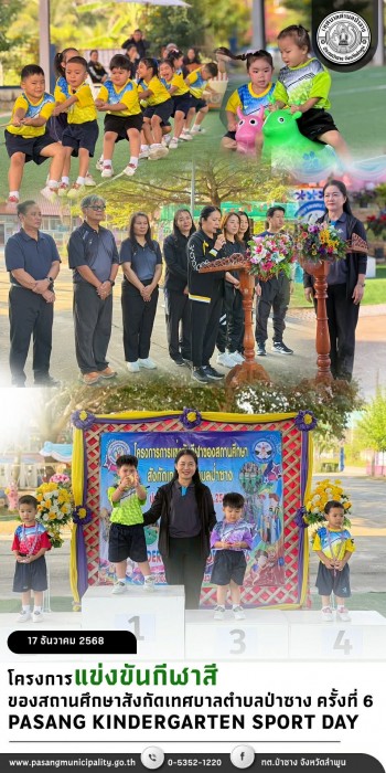. วันพุธที่ 17 ธันวาคม พ.ศ.2568 นางสุพัตรา จันทร์ศิริ ปลัดเทศบาล ปฏิบัติหน้าที่นายกเทศมนตรีตำบลป่าซาง เป็นประธานเปิด"โครงการแข่งขันกีฬาสีของสถานศึกษาสังกัดเทศบาลตำบลป่าซาง ครั้งที่ 6 PASANG KINDERGARTEN SPORT DAY " โดยมี นางศรีวรรณ ใจเครือคำ รองปลัดเทศบาลตำบลป่าซาง เป็นผู้กล่าวรายงาน