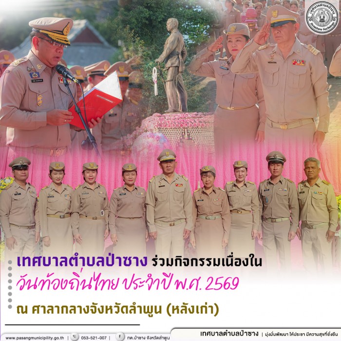 . วันพุธที่ 18 มีนาคม พ.ศ. 2569 นายสมเจตน์ วุฒิพงศ์ชัยกิจ นายกเทศมนตรีตำบลป่าซาง มอบหมายให้ นายวิโรจน์ นิไทรโยค รองนายกเทศมนตรีตำบลป่าซาง พร้อมด้วย นางสุพัตรา จันทร์ศิริ ปลัดเทศบาลตำบลป่าซาง และพนักงาน-เจ้าหน้าที่ในสังกัด ร่วมพิธีถวายราชสักการะฯ พระบาทสมเด็จพระจุลจอมเกล้าเจ้าอยู่หัว เนื่องในวันท้องถิ่นไทย ประจำปี พ.ศ.2569 โดยมี นายโยธิน ประสงค์ความดี รองผู้ว่าราชการจังหวัดลำพูน เป็นประธานในพิธีฯ