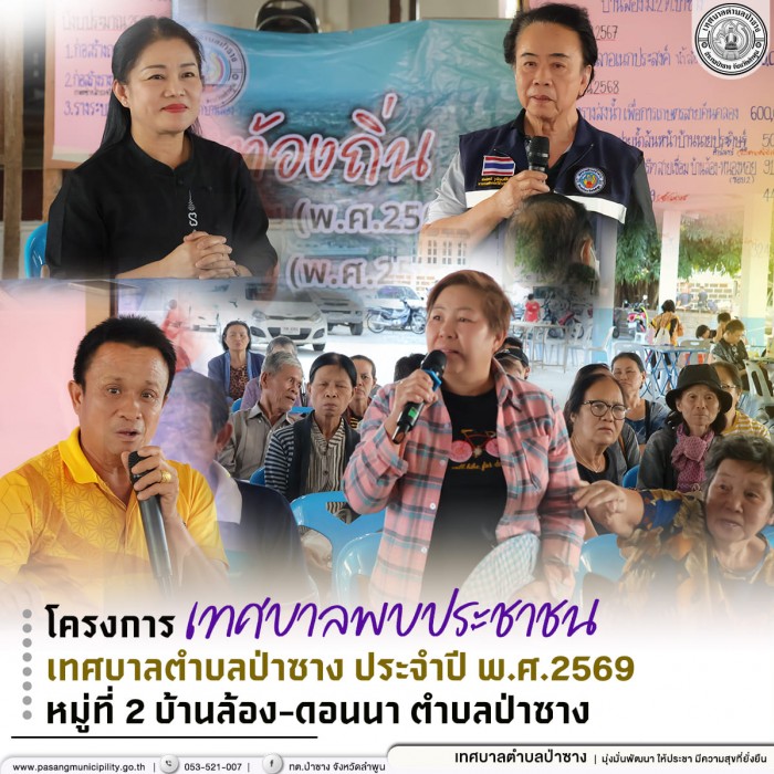 . วันจันทร์ที่ 23 มีนาคม พ.ศ.2569 นายสมเจตน์ วุฒิพงศ์ชัยกิจ นายกเทศมนตรีตำบลป่าซาง และ นางสุพัตรา จันทร์ศิริ ปลัดเทศบาลตำบลป่าซาง ร่วมพบปะพูดคุยกับผู้เข้าร่วมโครงการเทศบาลพบประชาชน ประจำปีงบประมาณ พ.ศ.2569 โดยมีกิจกรรมการให้บริการจากส่วนราชการในสังกัดเทศบาลตำบลป่าซาง และการให้บริการจากหน่วยงานบูรณาร่วม อาทิ บจก.โตโยต้านครพิงค์ ร้านเหรียญทองการแว่น ศูนย์ส่งเสริมการเรียนรู้ ระดับอำเภอป่าซาง เป็นต้น พร้อมทั้งกิจกรรมประชาคมแผนท้องถิ่น เพื่อร่วมทบทวนแผนพัฒนาท้องถิ่น (พ.ศ.2566-2570) และ จัดทำแผนพัฒนาท้องถิ่น (พ.ศ.2571-2575)