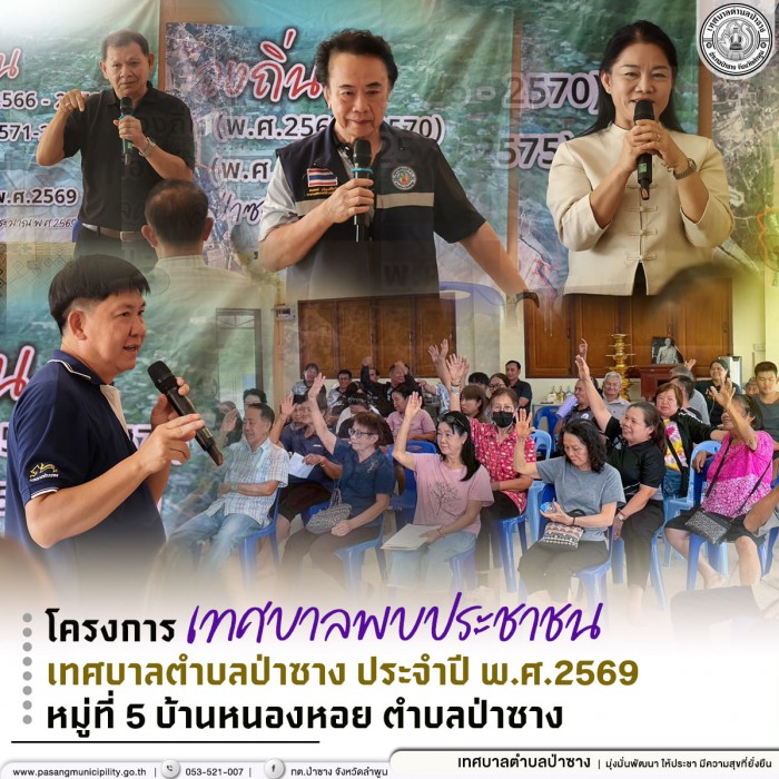 . วันอังคารที่ 24 มีนาคม พ.ศ.2569 นายสมเจตน์ วุฒิพงศ์ชัยกิจ นายกเทศมนตรีตำบลป่าซาง พร้อมด้วย นายวิโรจน์ นิไทรโยค รองนายกเทศมนตรีตำบลป่าซาง และ นางสุพัตรา จันทร์ศิริ ปลัดเทศบาลตำบลป่าซาง ร่วมพบปะพูดคุยกับผู้เข้าร่วมโครงการเทศบาลพบประชาชน ประจำปีงบประมาณ พ.ศ.2569 โดยมีกิจกรรมการให้บริการจากส่วนราชการในสังกัดเทศบาลตำบลป่าซาง และการให้บริการจากหน่วยงานบูรณาร่วม อาทิ วิทยาลัยการอาชีพป่าซาง ร้านเหรียญทองการแว่น ศูนย์ส่งเสริมการเรียนรู้ ระดับอำเภอป่าซาง เป็นต้น พร้อมทั้งกิจกรรมประชาคมแผนท้องถิ่น เพื่อร่วมทบทวนแผนพัฒนาท้องถิ่น (พ.ศ.2566-2570) และ จัดทำแผนพัฒนาท้องถิ่น (พ.ศ.2571-2575)