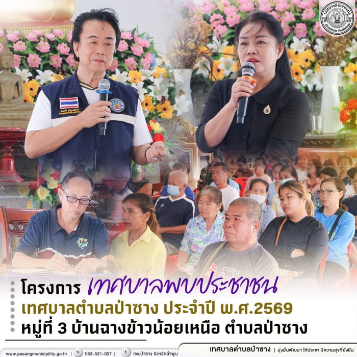 . วันจันทร์ที่ 30 มีนาคม พ.ศ.2569 นายสมเจตน์ วุฒิพงศ์ชัยกิจ นายกเทศมนตรีตำบลป่าซาง และ นางสุพัตรา จันทร์ศิริ ปลัดเทศบาลตำบลป่าซาง ร่วมพบปะพูดคุยกับผู้เข้าร่วมโครงการเทศบาลพบประชาชน ประจำปีงบประมาณ พ.ศ.2569 โดยมีกิจกรรมการให้บริการจากส่วนราชการในสังกัดเทศบาลตำบลป่าซาง และการให้บริการจากหน่วยงานบูรณาร่วม อาทิ ร้านเหรียญทองการแว่น เป็นต้น พร้อมทั้งกิจกรรมประชาคมแผนท้องถิ่น เพื่อร่วมทบทวนแผนพัฒนาท้องถิ่น (พ.ศ.2566-2570) และ จัดทำแผนพัฒนาท้องถิ่น (พ.ศ.2571-2575)