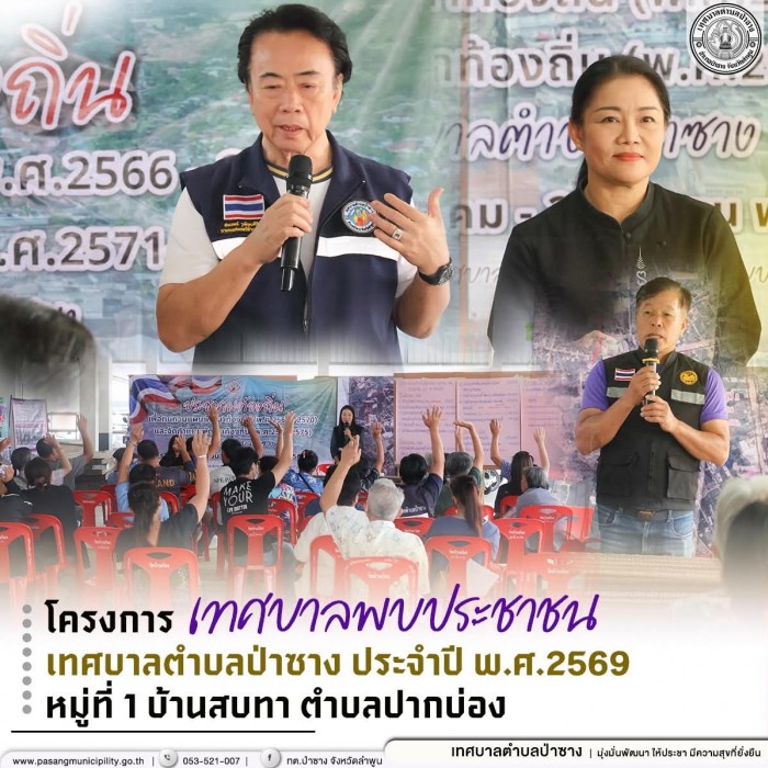 . วันศุกร์ที่ 3 เมษายน พ.ศ.2569 นายสมเจตน์ วุฒิพงศ์ชัยกิจ นายกเทศมนตรีตำบลป่าซาง และ นางสุพัตรา จันทร์ศิริ ปลัดเทศบาลตำบลป่าซาง ร่วมพบปะพูดคุยกับผู้เข้าร่วมโครงการเทศบาลพบประชาชน ประจำปีงบประมาณ พ.ศ.2569 โดยมีกิจกรรมการให้บริการจากส่วนราชการในสังกัดเทศบาลตำบลป่าซาง และการให้บริการจากหน่วยงานบูรณาร่วม อาทิ ศูนย์ส่งเสริมการเรียนรู้ ระดับอำเภอป่าซาง ร้านเหรียญทองการแว่น เป็นต้น พร้อมทั้งกิจกรรมประชาคมแผนท้องถิ่น เพื่อร่วมทบทวนแผนพัฒนาท้องถิ่น (พ.ศ.2566-2570) และ จัดทำแผนพัฒนาท้องถิ่น (พ.ศ.2571-2575)