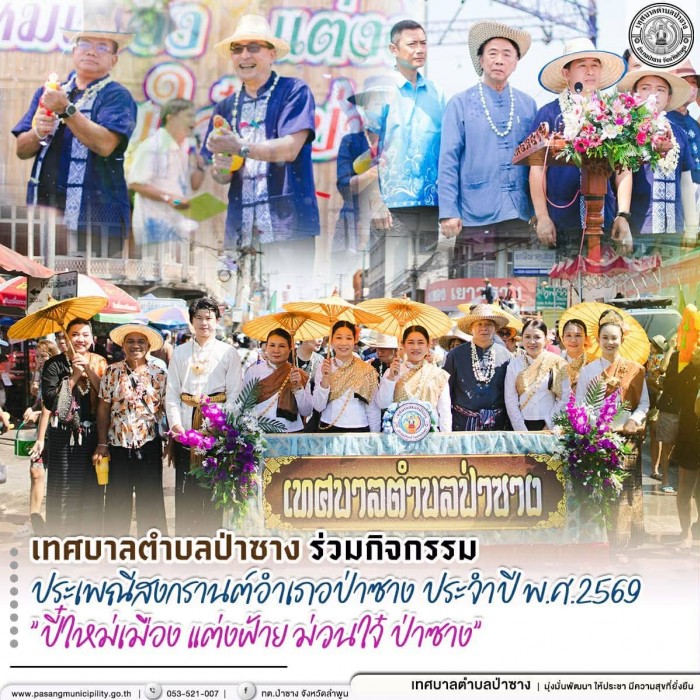 . วันพุธที่ 15 เมษายน พ.ศ.2569 เทศบาลตำบลป่าซาง นำโดย นายสมเจตน์ วุฒิพงศ์ชัยกิจ นายกเทศมนตรีตำบลป่าซาง คณะผู้บริหารเทศบาลตำบลป่าซาง สมาชิกสภาเทศบาลตำบลป่าซาง พนักงานเจ้าหน้าที่ในสังกัด พร้อมด้วย กำนัน-ผู้ใหญ่บ้าน ผู้นำชุมชน กลุ่มสตรีแม่บ้าน กลุ่มผู้สูงอายุ กลุ่มเด็กและเยาวชน ในเขตพื้นที่เทศบาลตำบลป่าซาง ร่วมพิธีเปิดและร่วมเดินขบวนแห่สงกรานต์ใน "งานประเพณีสงกรานต์อำเภอป่าซาง ประจำปี 2569" ภายใต้ชื่อกิจกรรม " ปี๋ใหม่เมือง แต่งฝ้าย ม่วนใจ๋ ป่าซาง" โดยมีนายปิยพงศ์ ชูวงศ์ ผู้ว่าราชการจังหวัดลำพูน เป็นประธานเปิดพิธีฯ และมี นายภัทรพล ผัดดวงธรรม นายอำเภอป่าซาง เป็นผู้กล่าวรายงาน
