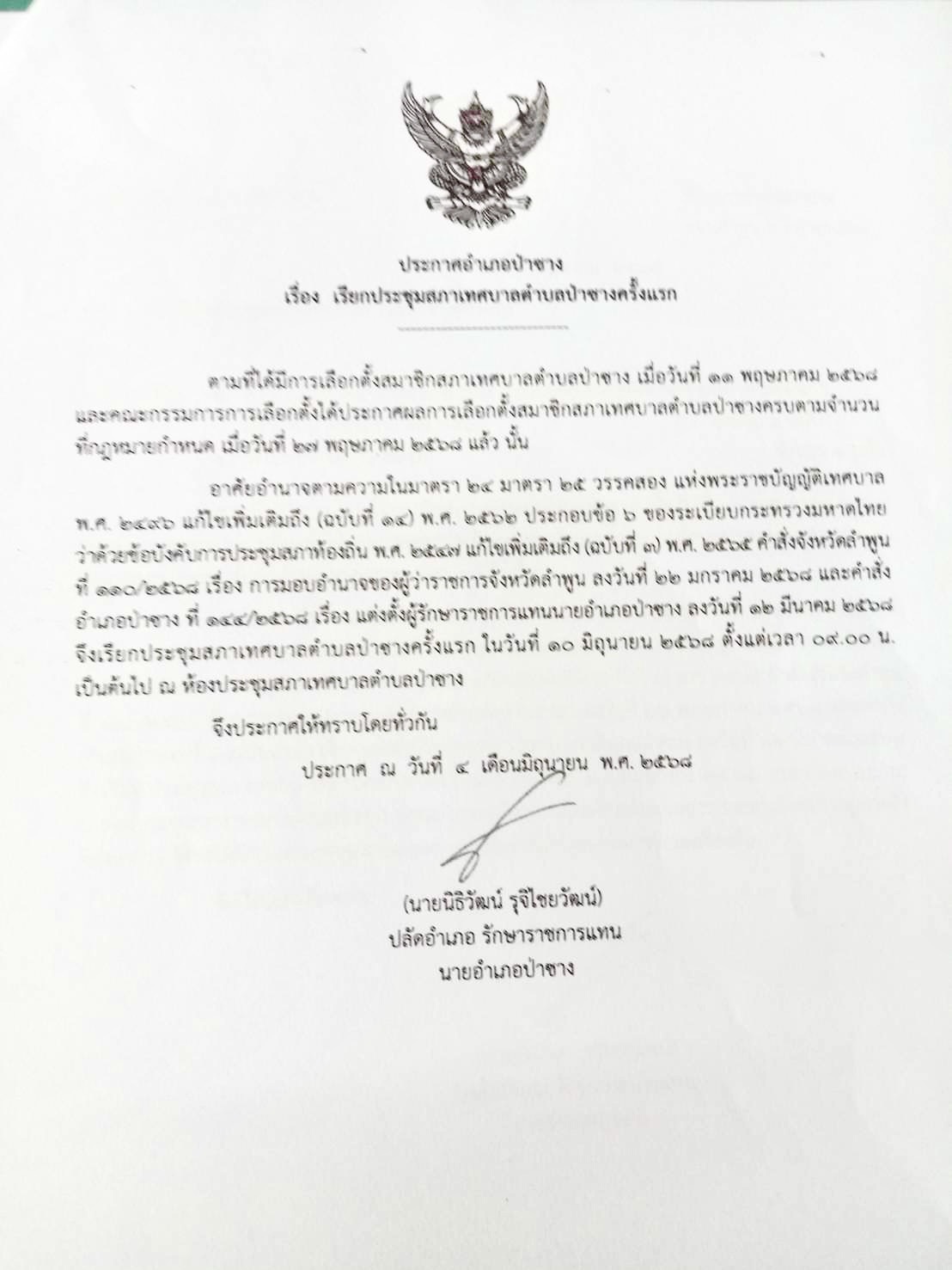 ประกาศอำเภอป่าซาง เรื่อง เรียกประชุมสภาเทศบาลตำบลป่าซาง