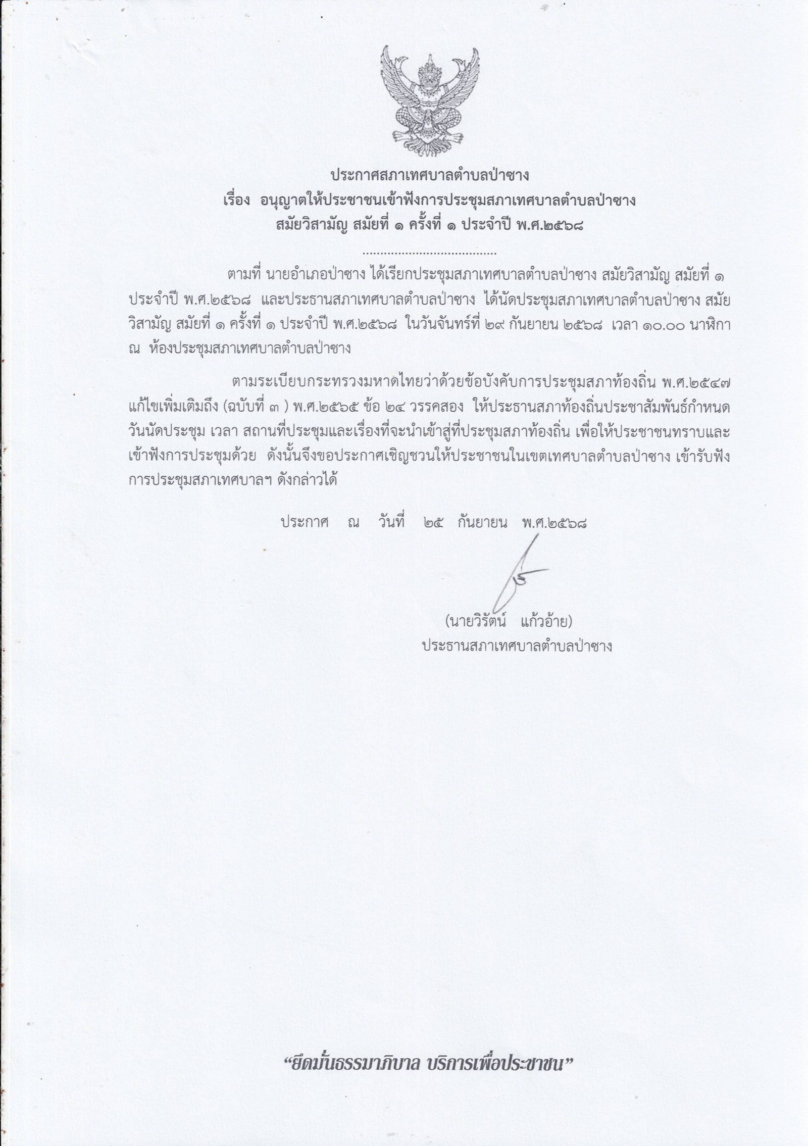 ประกาศสภาเทศบาลตำบลป่าซาง เรื่องอนุญาตให้ประชาชนเข้ารับฟังการประชุมสภาเทศศบาลตำบลป่าซาง สมัยวิสามัญ สมัยที่ 1 ครั้งที่ 1 ประจำปี พ.ศ.2568