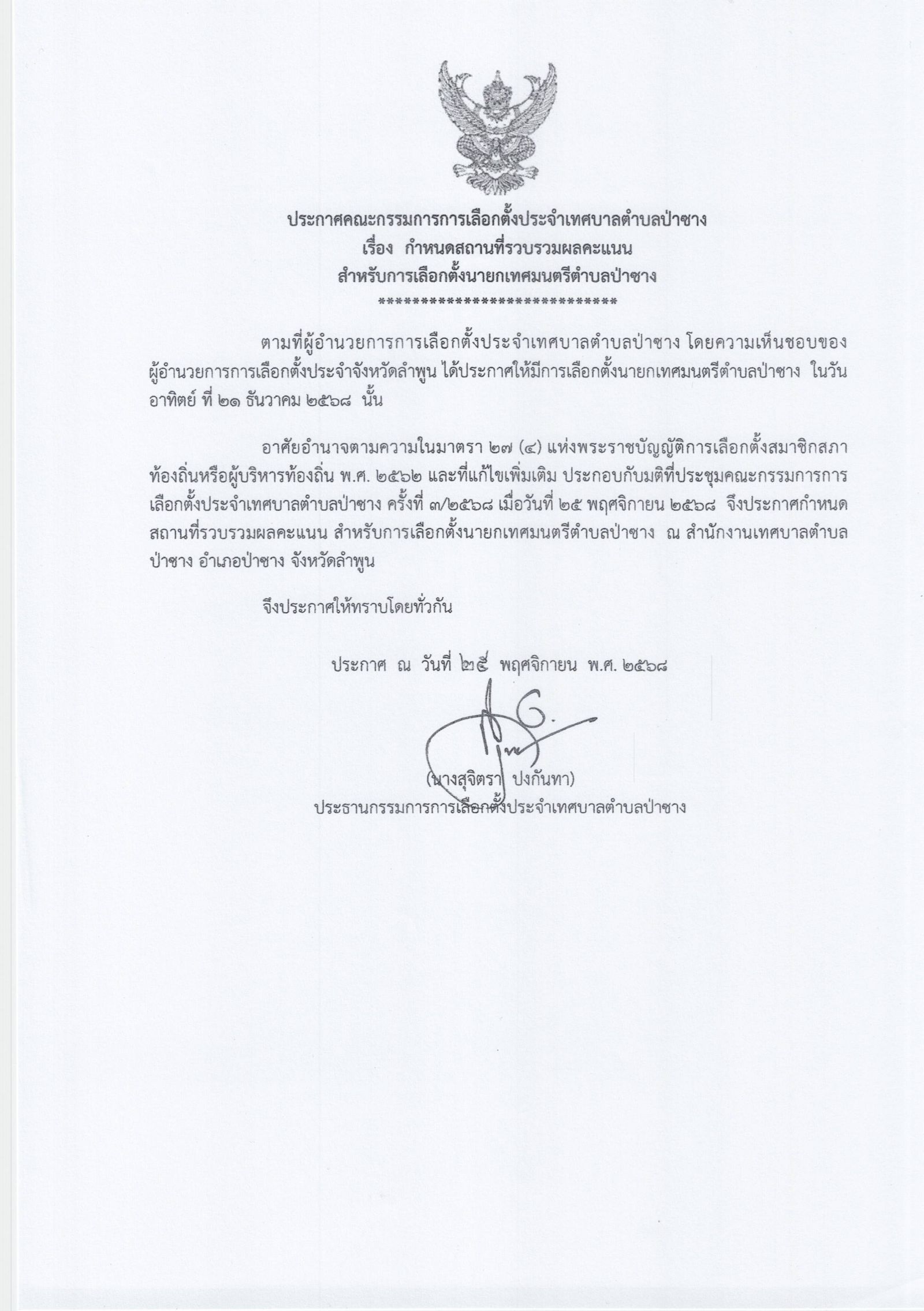 ประกาศคณะกรรมการการเลือกตั้งประจำเทศบาลตำบลป่าซาง เรื่อง กำหนดสถานที่รวบรวมผลคะแนน สำหรับการเลือกตั้งนายกเทศมนตรีตำบลป่าซาง