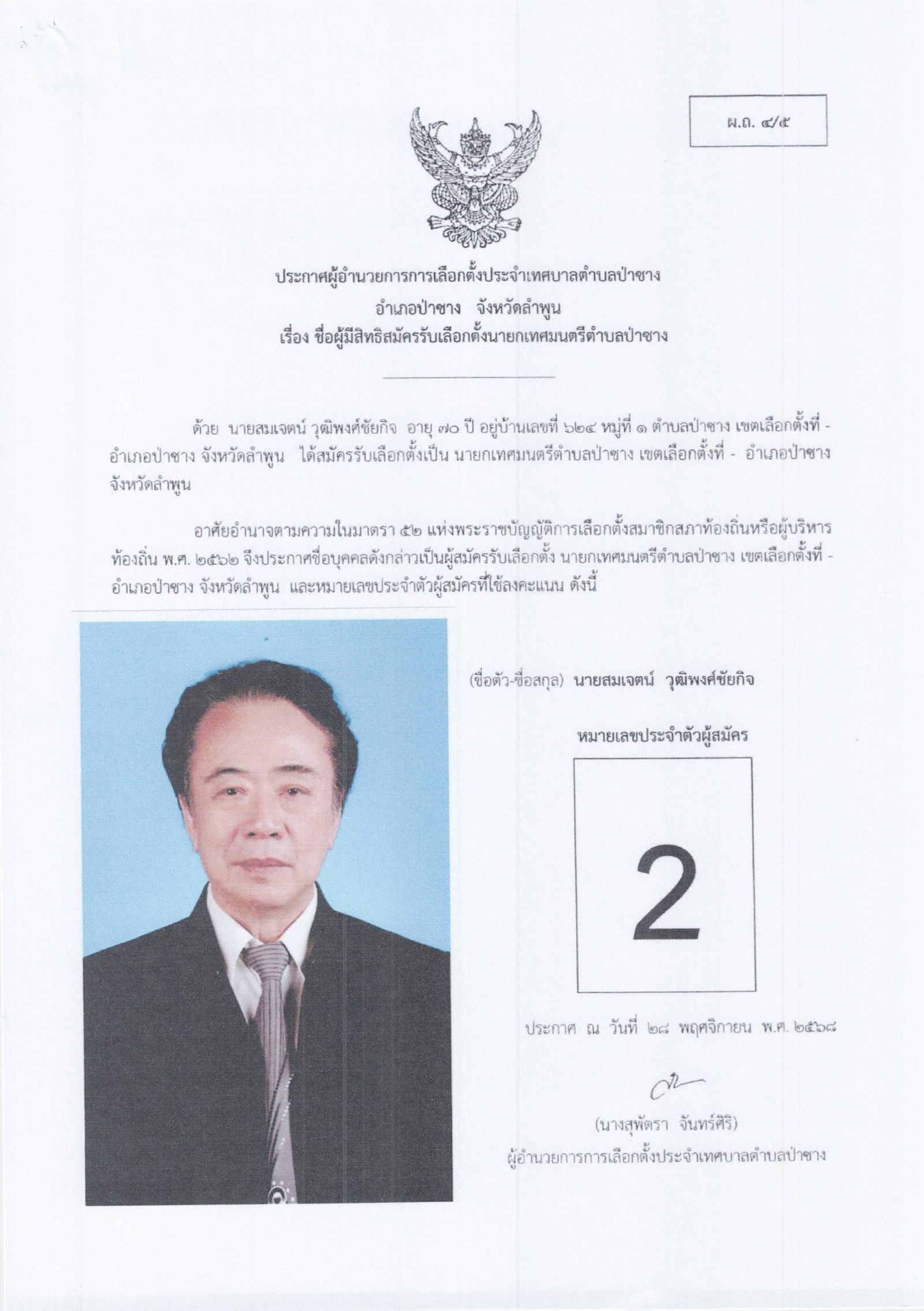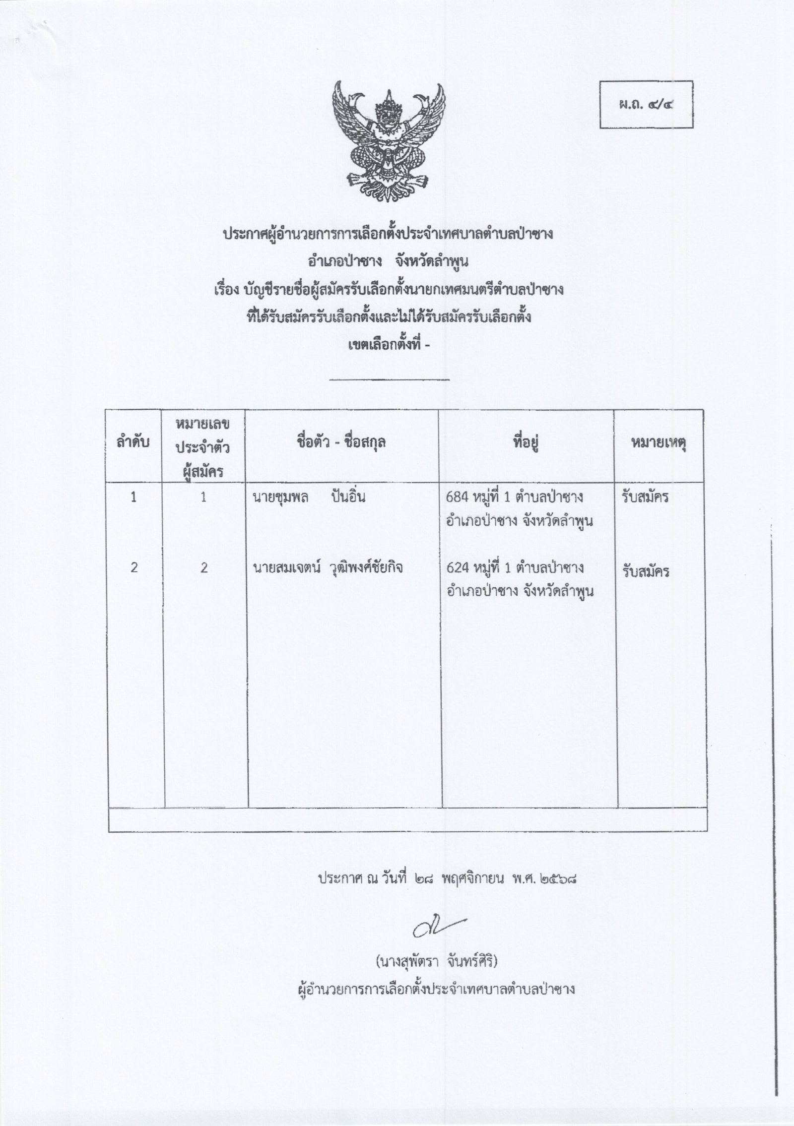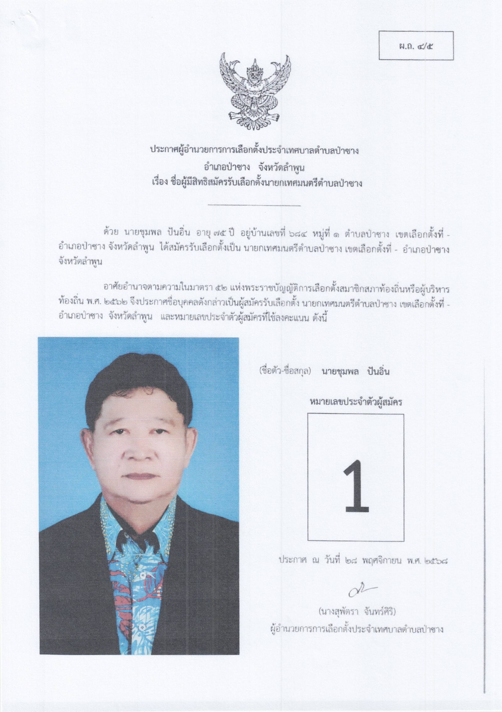 ประกาศผู้อำนวยการการเลือกตั้งประจำเทศบาลตำบลป่าซาง เรื่อง บัญชีรายชื่อผู้สมัครรับเลือกตั้งนายกเทศมนตรีตำบลป่าซางที่ได้รับสมัครรับเลือกตั้งและไม่ได้สมัครรับเลือกตั้ง