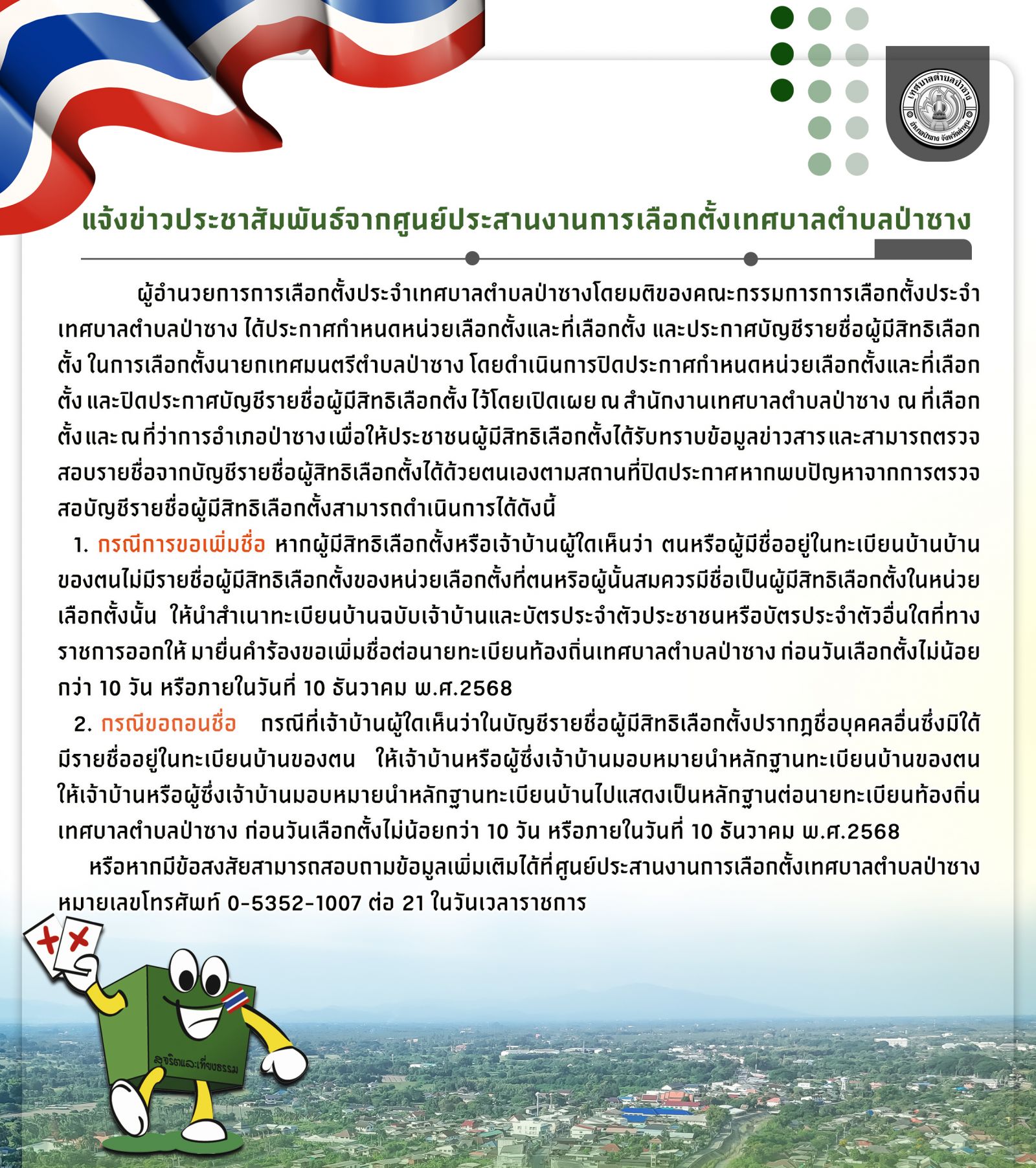 แจ้งประชาสัมพันธ์ศูนย์ประสานงานการเลือกตั้งประจำเทศบาลตำบลป่าซาง