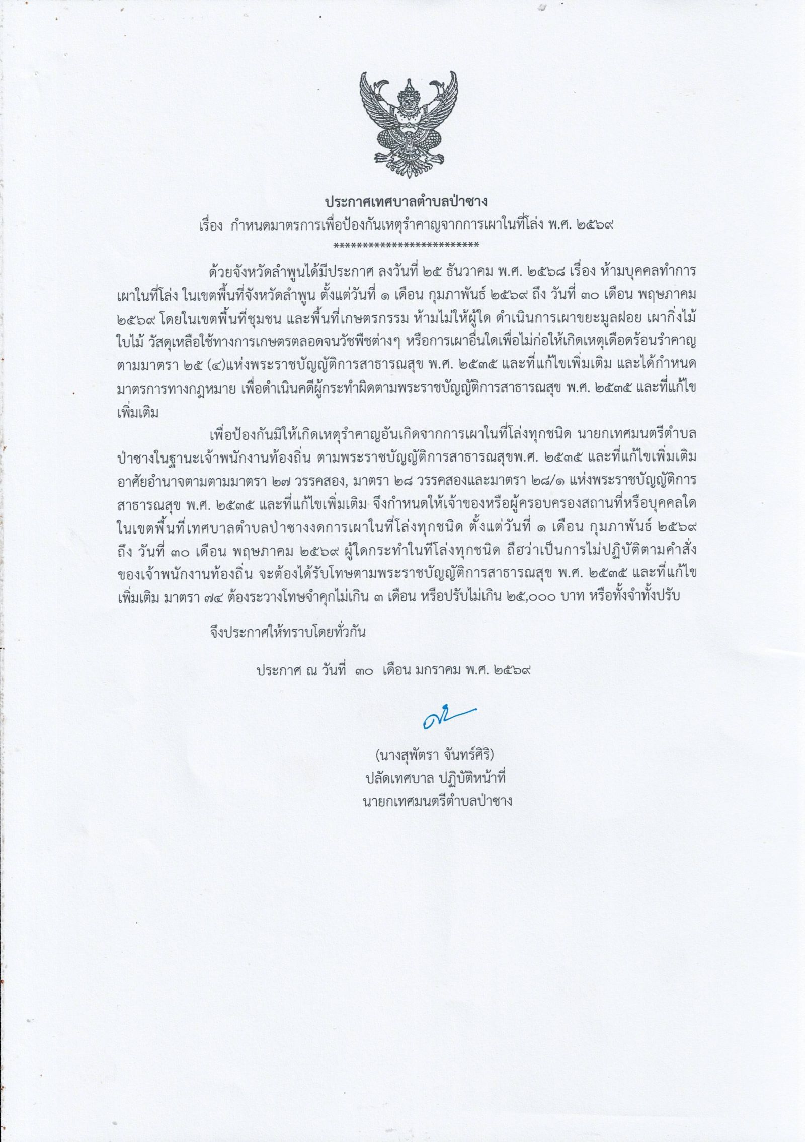 ประกาศเทศบาลตำบลป่าซาง เรื่อง กำหนดมาตราการเพื่อป้องกันเหตุรำคาญจากการเผาในที่โล่ง พ.ศ.2569