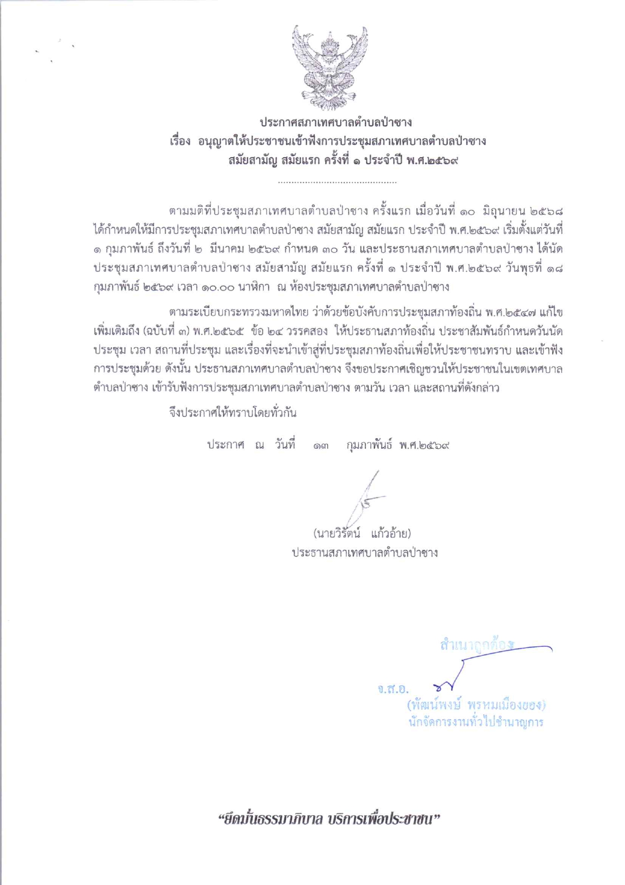 ประกาศสภาเทศบาลตำบลป่าซาง เรื่อง อนุญาตให้ประชาชนเข้าฟังการประชุมสภาเทศบาลตำบลป่าซาง